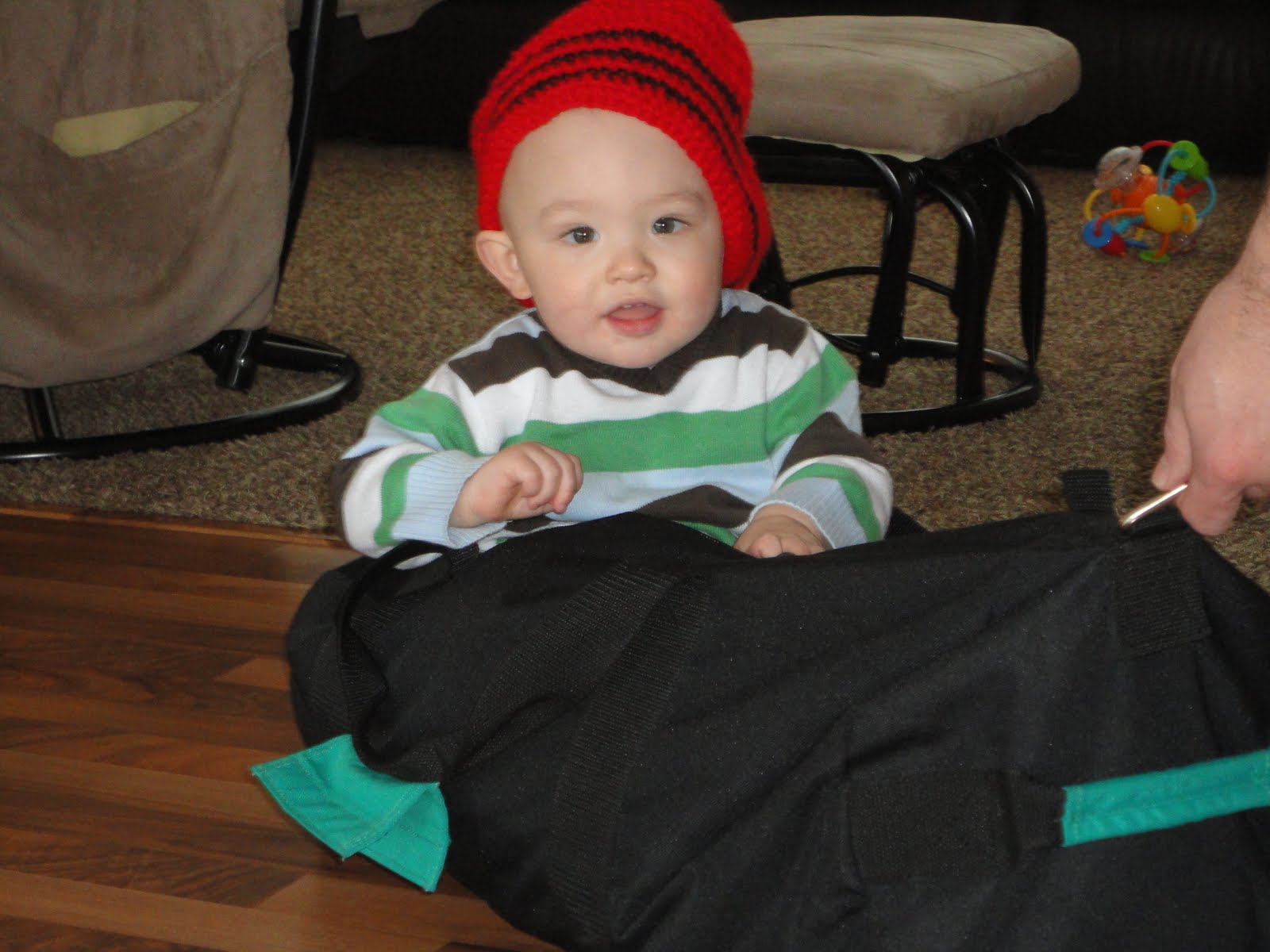 Playing in daddy's snow gear bag